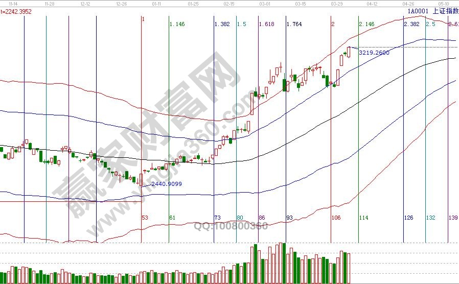 大盤日K線不斷刷新近期高點(diǎn),極反通道紅色外軌線是3250附近,站穩(wěn)一線看高一線規(guī)則,此線是確認(rèn)藍(lán)線后反彈的目標(biāo)位;空間點(diǎn)位上,輪中輪、價(jià)格四方形提示,3196-3175為盤中支撐,3240-3254為盤中壓力,4月5號(hào)為日線時(shí)間窗口,考慮假期因素,時(shí)間窗口效應(yīng)會(huì)提前至4或推遲下周一8號(hào)。操作策略,日線再度進(jìn)入超強(qiáng)通道,穩(wěn)健者倉(cāng)位保持在5成,激進(jìn)者倉(cāng)位保持在7成,靠近紅色外軌線持倉(cāng)遵守提高止賺位策略。