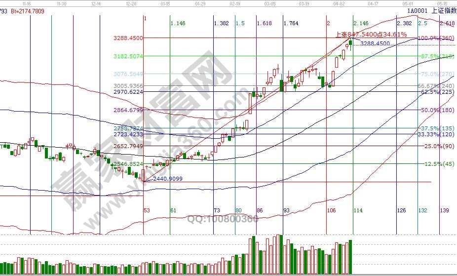 大盤(pán)日K線如期按規(guī)則站穩(wěn)一線看高一線,從極反通道藍(lán)色上軌線反攻到紅色外軌線,上周分析中已談到,指數(shù)本周進(jìn)入日線時(shí)間窗口周期,同時(shí)到達(dá)紅色外軌線走勢(shì)將轉(zhuǎn)反復(fù),但整體震蕩上攻趨勢(shì)未改變;空間方面,波段百分比延伸線3倍循環(huán)180度3360接近,江恩輪中輪135度是3356點(diǎn)【3350附近是多周期共振位,短線、波段均是風(fēng)險(xiǎn)大于機(jī)會(huì)】,短期壓力是3261、3283點(diǎn),短期支撐3228、3196點(diǎn);時(shí)間方面,本周是4月時(shí)間窗口密集區(qū)間,8-15號(hào)跟蹤與紅色外軌線關(guān)注。操作策略,日線超強(qiáng)通道運(yùn)行,穩(wěn)健者倉(cāng)位保持在5成,激進(jìn)者倉(cāng)位保持在7成,靠近紅色外軌線持倉(cāng)遵守提高止賺位分批獲利。