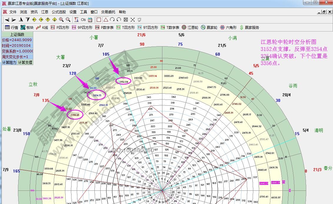 ☆依據(jù)贏家江恩理論系輪中輪提示:以2440點(diǎn)為起點(diǎn)做江恩輪中輪時空循環(huán)圖,大盤收盤站在三角形120度3254點(diǎn)下方,19號早盤關(guān)注此位置得失,向上循環(huán)是3305點(diǎn),向下循環(huán)是3203點(diǎn),上下選擇以120度3254點(diǎn)做決策,今日收盤在3254點(diǎn)下按規(guī)則看空。