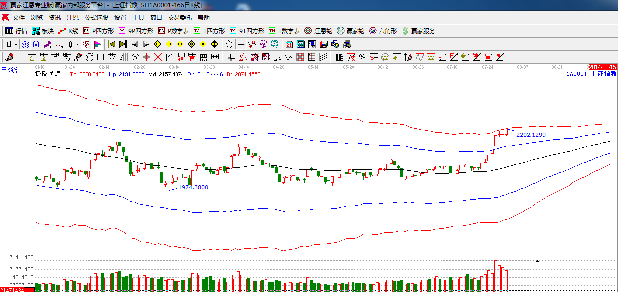 極反通道提示:指數(shù)突破2200再創(chuàng)年內(nèi)新高,逼近紅色外軌阻力線,預(yù)計(jì)明日大盤將沖高回落。