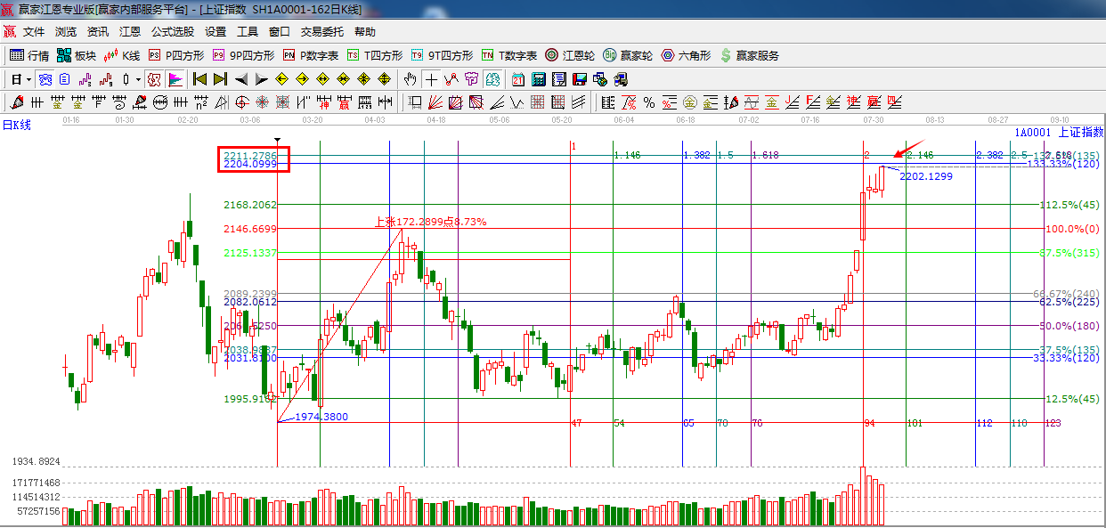 江恩看盤綜述:依據(jù)贏家江恩技術(shù)工具分析得出:午后指數(shù)突破2200在創(chuàng)年內(nèi)新高,量能同比縮小,周五關(guān)注上方阻力2204-2211區(qū)間阻力,預(yù)計(jì)指數(shù)將小幅沖高后回落。操作上,合理控制倉(cāng)位,做好高拋低吸。