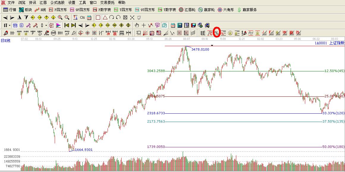 然后我們用江恩價格百分比在大盤2009-08-04日3478.01點作圖計算支撐位置。用心的朋友不難發(fā)現(xiàn)其重要的秘密,那就是他們都有45度【12.5%】90度【25%】120度【33.33】180度【50%】那么他們的點位是如何計算出來的呢?這些點位都跟3478.01點都有這重要行的關(guān)系;45度位置如何計算出來的呢?