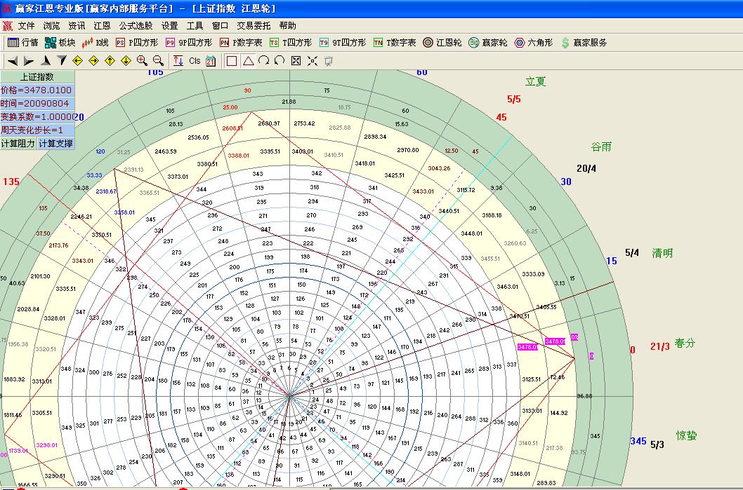 45度=3478.01-(3478.01*12.50)=3043.2588依次類推我們就可以知道90度位置 點位是2608.5075點120度點位是2318.6733點。上面就是江恩輪中輪重要點位的重要算法。其實就是把點位進行了3等分8等分,而這些東西3跟4 無不在江恩理論中出現(xiàn)。而這些在金融市場也完美的體驗著神奇