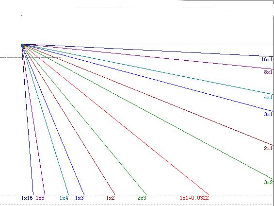 甘氏線的基本比例是1:1,也就是經(jīng)常說的1*1線。表示單位時(shí)間內(nèi)運(yùn)行了一個(gè)價(jià)格單位。此外,甘氏線還有1*8、1*4、1*3、2*3等比例,每一條甘氏線都構(gòu)成對(duì)應(yīng)的幾何角度。如下圖:
