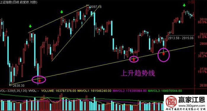 上圖是本人在2017年1月17日做所的一張上證指數(shù)圖,顯然上面就是一個非常明顯的上升趨勢線,就是以每一次的低點的連線來畫線,像上面那樣就是上升趨勢線,當(dāng)然相反的下降趨勢線就是以反彈的高點連線來做線,如果股價突破下降趨勢線,那么即意味著股價將會反轉(zhuǎn)。所以趨勢線就是相鄰兩個低點或者高點所構(gòu)成的直線射線延伸。顯然是不同與上面所講的江恩角度線的。