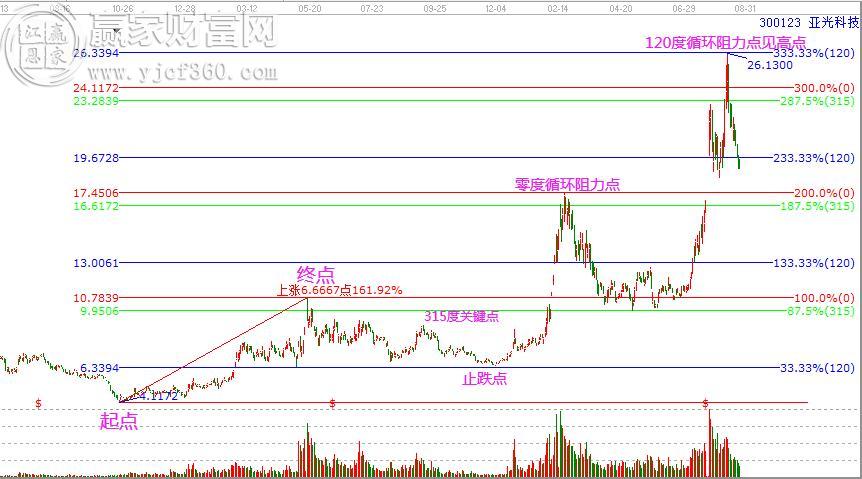 圖形解析:亞光科技,以2018年10月19日低點到2019年5月14日高點這波上漲波段為起始因子,通過研究波段內(nèi)的走勢,可以發(fā)現(xiàn)止跌點在120度,反抽點在315度。因此保留這兩個分割位,突破后,第一波拉升頂部在200%的0度循環(huán)阻力點,隨后回撤到零度-315度分割區(qū)間止跌再次起漲,并最終在333.33%循環(huán)阻力點見高點,這個高點是233.33%起點的循環(huán)0度位。