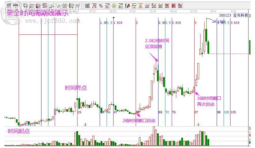 圖形解析:亞光科技,以2018年10月19日低點到2019年5月17日高點的周線為起始周期。同時保留最關鍵的0.382、0.5、0.618分割位。可以看到,股價在2倍時間窗口啟動拉升,在2.382倍時間窗口拐點向下,3倍時間窗口再次啟動趨勢拉升行情。兩波大幅度上漲行情,都是出現(xiàn)在倍數(shù)位,可通過該工具完美把握。因此,接下來的4倍時間窗口就尤其關鍵了。