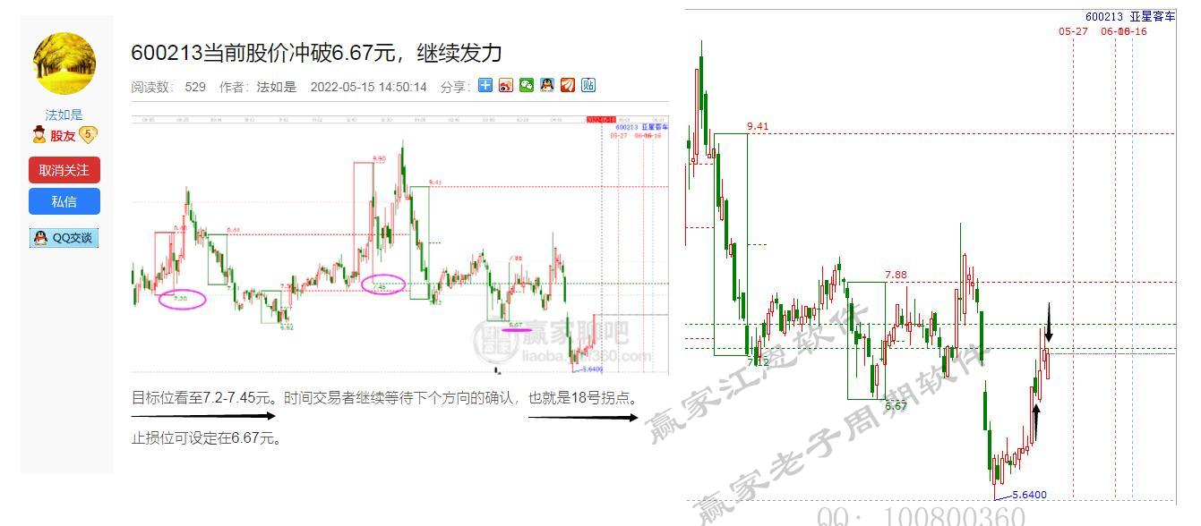 八、亞星客車(chē),時(shí)間和價(jià)格都按照預(yù)測(cè)給了。15號(hào)預(yù)測(cè)價(jià)格7.2-7.45元。時(shí)間18號(hào)窗口。后市止盈信號(hào),4天工具信號(hào)利潤(rùn)空間5.88%元!再次驗(yàn)證何時(shí)何價(jià)的技術(shù)信號(hào)!