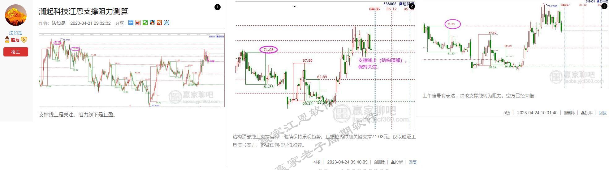 以瀾起科技為例,4月21號關(guān)注,空間上股價已經(jīng)站上十二宮下跌結(jié)構(gòu)頂部71.03元并獲得支撐,按照規(guī)則,線上為支撐,視為關(guān)注信號。第二步,計劃漲多高,也就是目標位設(shè)定哪個空間層次,什么價格。