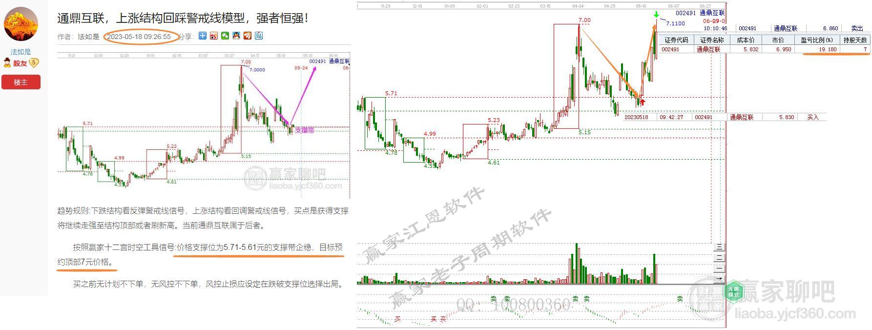案例通鼎互聯(lián)為例,自5月18日早盤(pán)前運(yùn)用贏家十二宮解析并持有,預(yù)期當(dāng)前支撐位5.71-5.61元,目標(biāo)位至7元。最終走出,歷時(shí)7天,抵達(dá)江恩分析法預(yù)測(cè)的特定波動(dòng)空間價(jià)格7元。盈虧比例快速達(dá)到19.18%。那么如何站在實(shí)戰(zhàn)角度預(yù)測(cè)如何歸于實(shí)盤(pán)交易呢?