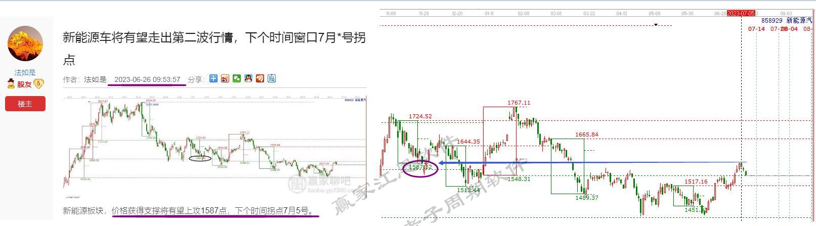 案例一:新能源汽車指數(shù)于6月26日運(yùn)用江恩時(shí)空技術(shù)解析:空間上獲得支撐位1517點(diǎn),有望上攻1587點(diǎn),時(shí)間上轉(zhuǎn)折點(diǎn)為7月5號。