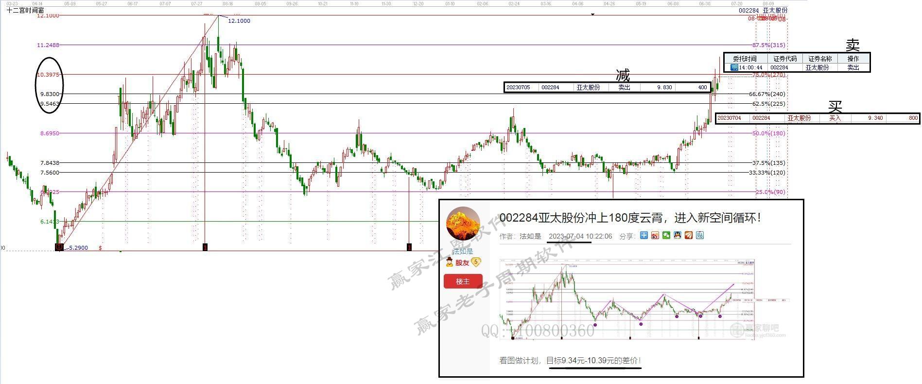 案例二:亞太股份,按照江恩空間技術(shù)規(guī)則(報(bào)名成為學(xué)員系統(tǒng)教學(xué)),底部確認(rèn)空間上的支撐,目標(biāo)看上漲阻力位,預(yù)期看多價(jià)格9.54-10.39元,,對應(yīng)江恩角度位置225度(62.5%=5/8)-270度(75%=6/8)。后續(xù)市場驗(yàn)證抵達(dá)。買點(diǎn)和賣點(diǎn)的預(yù)期完全按照計(jì)劃執(zhí)行。江恩獨(dú)有空間把握起著預(yù)判趨勢以及買賣點(diǎn)位的作用,獲利利潤落袋兌現(xiàn)空間財(cái)富。