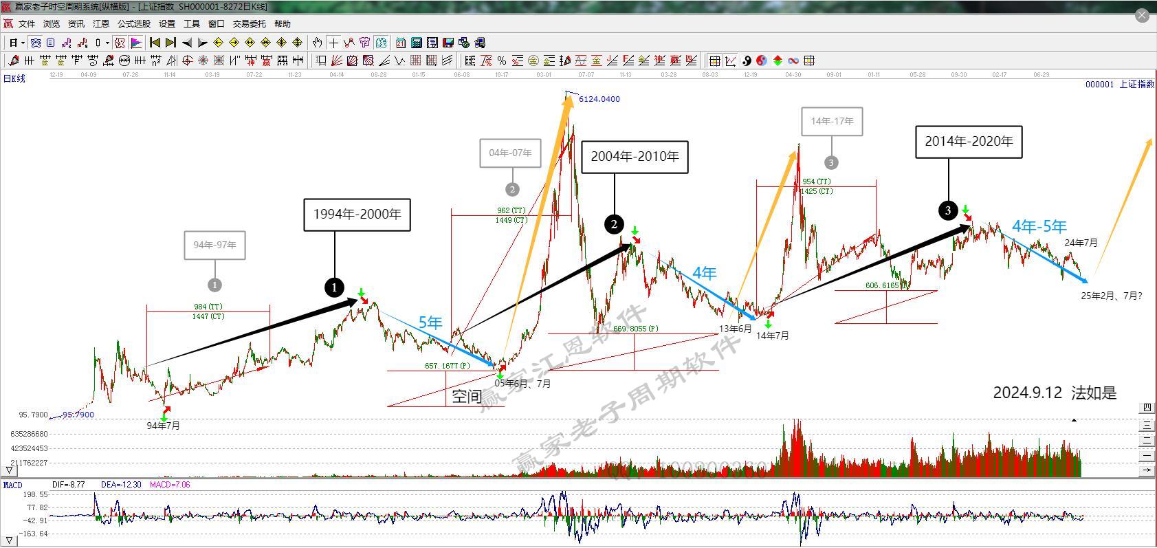 再看時間,縱觀歷史以94年為時間起點(diǎn),每輪大的上漲周期均為6年,下跌周期為4年,共計10年。說明:贏家的時空周期誤差單位為1(年/月/周/日),若以年為單位,上下空間幅度在100點(diǎn)之內(nèi)(即是圖中669點(diǎn)-606點(diǎn)),左右時間的誤差同樣在1年(即是圖中回調(diào)4年-5年)。以月為單位,每次大牛的時間啟動點(diǎn)均在7月(即是圖中的6月7月),研究歷史預(yù)判未來,以史為鏡知興替。本次時空圖表顯示,上證指數(shù)即將醞釀形成第四輪大牛市,相似相當(dāng)即為重復(fù),預(yù)計本輪時間啟動點(diǎn)大概率還會在2025年7月左右?;仡櫄v史,下跌5年周期后,空間拉升歷史最高點(diǎn)6000點(diǎn),那么本輪若同樣以回調(diào)5年的重復(fù),空間6000點(diǎn)-10000點(diǎn)都是大有可能的。同理再往后大膽預(yù)測小心求證,2030年是否同樣要規(guī)避4-5年的風(fēng)險周期?直至2034年左右重新開啟新一輪的牛市行情?老祖宗說過,歷史在重復(fù)發(fā)生...太陽底下沒有新鮮事...所以時勢造英雄,一定是順勢而為!