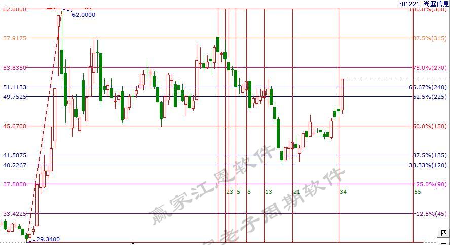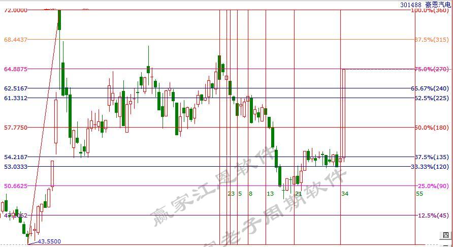 同一板塊下的豪恩汽電,工具信號:1.同樣的時間內(nèi)12月10日-1月6日的下跌趨勢相比,空間上光庭信息雖更具有支撐位優(yōu)勢(光庭信息下跌波動節(jié)奏在120度止跌,豪恩汽電下跌波動節(jié)奏在90度止跌),但豪恩汽電當下走勢恰好處于三分位支撐,兩股相比,豪恩汽電更具持成本優(yōu)勢,結(jié)合費氏時間,2月5日的時間變盤點,形成時價四方的技術(shù)信號。2.光庭信息于6號后的上漲雖強于豪恩汽電,但還是那句話臥久者飛必高,對于三分位處的橫盤個股來說時間就是起爆因子,買在變盤點處跟隨即是財富!