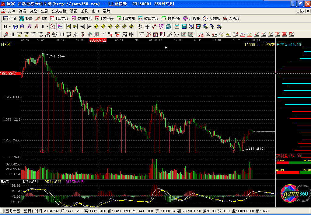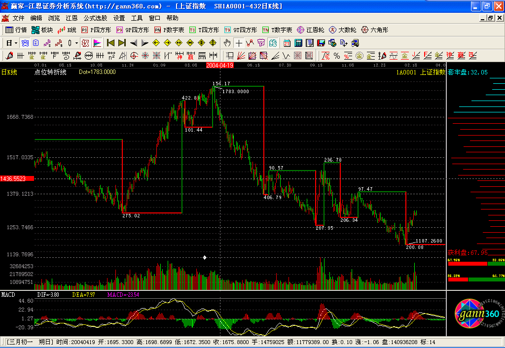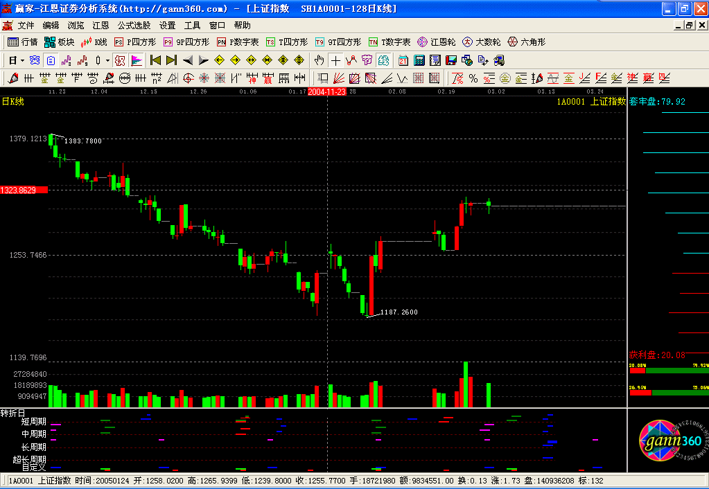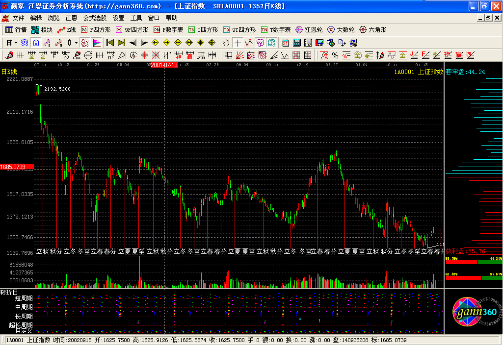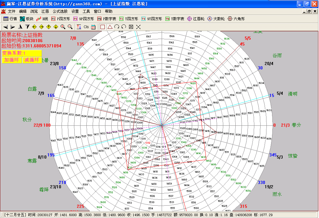 本軟件除實(shí)現(xiàn)了江恩的經(jīng)典判市工具:包括江恩輪、價(jià)格正方形、九格價(jià)格正方形、時(shí)間正方形、九格時(shí)間正方形、六角形、角度線、江恩計(jì)算器、時(shí)間及價(jià)格循環(huán)線、時(shí)間周期線、江恩價(jià)格回調(diào)帶外,增加了百分比線、百分比延伸線、黃金延伸線、黃金回調(diào)帶、黃金分割阻力支撐線、k線價(jià)格四方形、自定義時(shí)間價(jià)格計(jì)算器、黃金時(shí)間周期線、螺旋時(shí)間周期線、自定義周天江恩時(shí)間循環(huán)線、平方時(shí)間循環(huán)線、三點(diǎn)周期線、螺旋歷法時(shí)間循環(huán)線、k線時(shí)間論中論(變盤點(diǎn))、k線時(shí)間四方形(變盤點(diǎn))、時(shí)間轉(zhuǎn)折日提示、24節(jié)氣轉(zhuǎn)折日提示、神奇周期線、神奇價(jià)格線、贏家周期線、自定義時(shí)間周期線、趨勢(shì)轉(zhuǎn)折線、點(diǎn)位跟蹤轉(zhuǎn)折線。