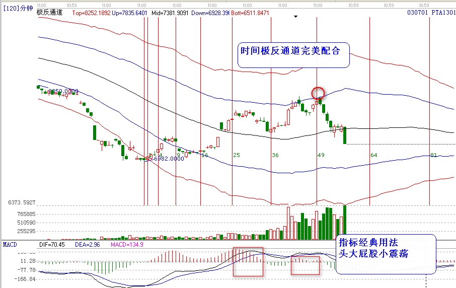 第一次遇到極反通道上軌壓力回踩,再次上攻遇到時(shí)間49【7*7=49】無功而返。指標(biāo)出現(xiàn)了柱子背離。3線共振