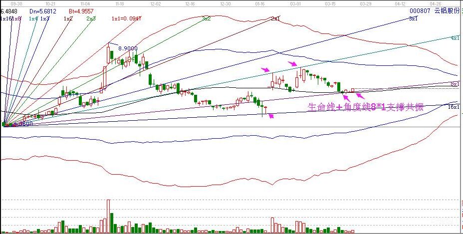 上面就是運(yùn)用我們的軟件所做的一個(gè)分析圖,近期的云鋁股份的走勢(shì)中,我們可以看到股價(jià)每次的高點(diǎn)低點(diǎn)都落在每條角度線(xiàn)位置線(xiàn)上,而且此時(shí)該股正是出在8*1線(xiàn)的支撐,同時(shí)它還處于極反通道的生命線(xiàn)支撐之上,二者形成了共振,所以大家可以對(duì)這只股進(jìn)行關(guān)注。顯然上面運(yùn)用到的指標(biāo)就是江恩角度線(xiàn)和極反通道。