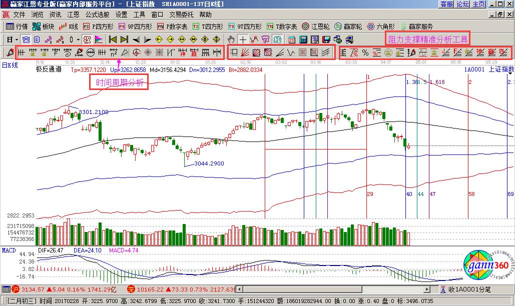 贏家江恩軟件最核心的分析是江恩的時間周期分析和阻力支撐分析(如下圖軟件界面圖形和兩大核心工具分布圖形)。只要掌握了這兩者的分析,也就是掌握了軟件分析的核心。下面逐步告訴新手來如何學(xué)習(xí)贏家江恩軟件。