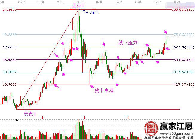 我們以上述股票為例,江恩波段百分比需要作圖:選取一個高點(diǎn)和低點(diǎn)作圖。這個高點(diǎn)和低點(diǎn)是歷史上的低點(diǎn)和高點(diǎn),對于后市的具有分析的點(diǎn)位。圖中選取了這波到達(dá)24.34位置的開始的低點(diǎn),以這波行情最高點(diǎn)24.34位置作為第二選點(diǎn)。畫法很簡單,選中軟件圖標(biāo)中的圖標(biāo),點(diǎn)擊凹陷,表示選中;接下來鼠標(biāo)放到低點(diǎn)下方,按住鍵盤上的shift鍵(可以精準(zhǔn)定位低點(diǎn)位置),定位后松開此鍵,右手按住鼠標(biāo)左鍵不松開,拖動到高點(diǎn)(此時也要像低點(diǎn)一樣精準(zhǔn)對準(zhǔn)高點(diǎn))選好點(diǎn)好松開鼠標(biāo)就可以完成上面的作圖。這個工具的用法一樣是線上支撐,線下阻力??梢钥吹綀D中高點(diǎn)和低點(diǎn)都出現(xiàn)分割線上。