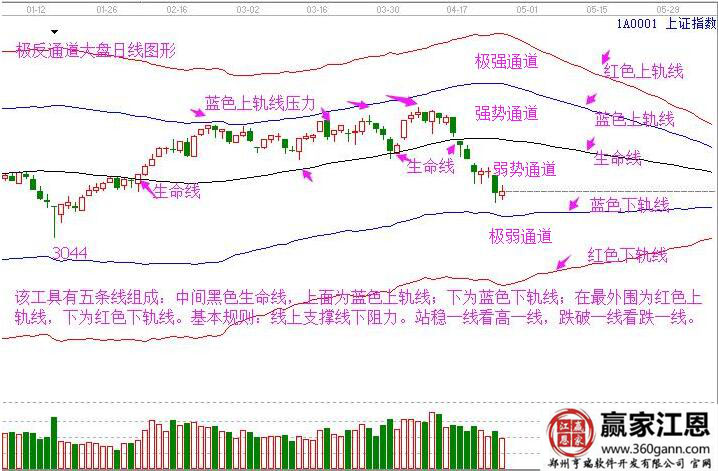 對于極反通道的學(xué)習(xí),先從工具的名稱和原理開始。名稱為極反通道,原理為物極必反。關(guān)于五條線和四個通道的名稱我在圖中已經(jīng)都標(biāo)出來了,大家對照記住就可以。剩下來就是最重要的用法了。極反通道是軟件中根據(jù)江恩分割比例為了使用編寫出來的趨勢工具,是軟件中最簡單使用最高的分析工具。無論是判斷大盤還是個股趨勢和買賣點(diǎn)都有重要的分析作用。其中生命線為趨勢強(qiáng)弱的分界點(diǎn),在生命線上為強(qiáng)勢,可以放心操作;在生命線下為弱勢,輕倉操作。