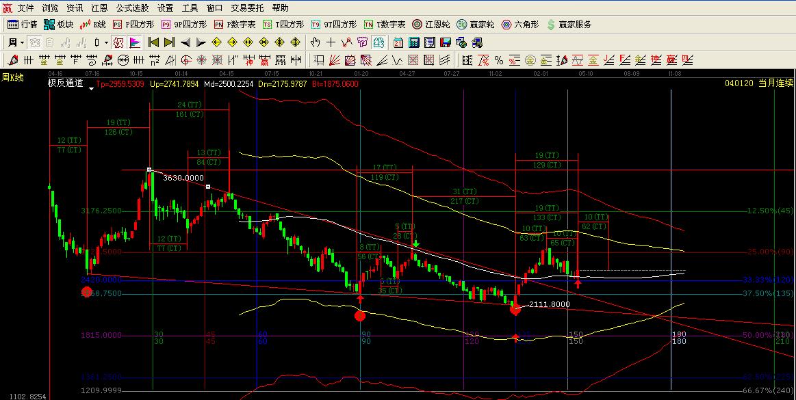 也可以從圖中看出股指期貨在其60周的時(shí)候出現(xiàn)為期5周的反彈,在其90周的時(shí)候出現(xiàn)了一波為期17周的反彈,始終被極反通道生命線死死的壓制一直陰雨連綿的下跌,在其重要的時(shí)間135度位置見底2111.80開始反攻,連續(xù)10周上揚(yáng)10周剛好是其30周的3分之一而這波下跌也是剛好下跌了10周這波殺跌剛好到極反通道生命線的位置企穩(wěn)拉升,就是按照極反通道交易規(guī)則,極反通道生命線2460不破看高一線至藍(lán)色上軌的位置2952點(diǎn)。