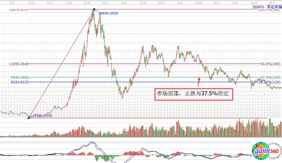 百分比回撤水平的探討主要是研究市場的價格,及阻力支撐的分析,因為一旦價格確定,其價格的波動區(qū)間也就確定了,所以,投資者重點關(guān)注市場的歷史走勢,以此為后市操作的重要依據(jù),例如市場每次回撤的位置都是在33.33%處,那么,你要參考的就不再是50%水平位,而是33.33%處,所以很多的時候在運用工具繼續(xù)分析的過程中我們要靈活運用。如下圖,市場回落,止跌與37.5%附近。