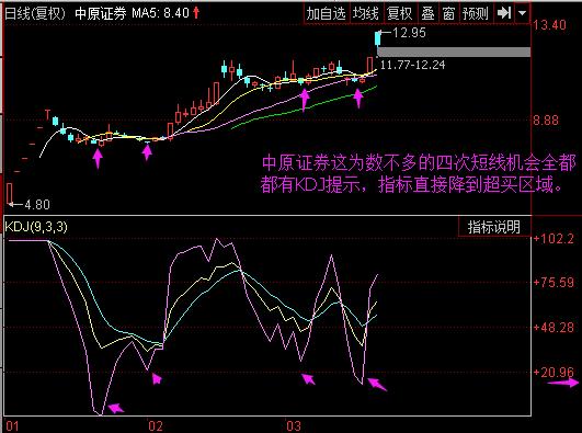 今天我們來說一下中原證券,這個股是最近比較熱的次新股,可以說是比較活躍的股票,那么用KDJ很合適。首先我們先看中原證券的KDJ圖形。從下圖中我們不難發(fā)現(xiàn)這些機會全部都有出現(xiàn)提示機會。