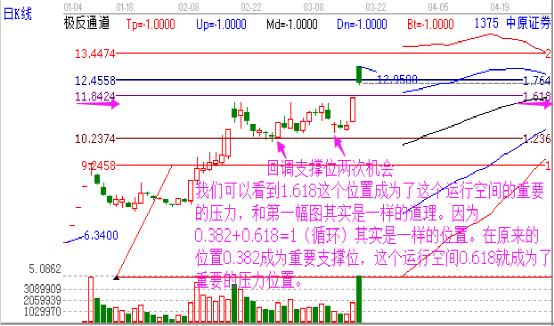 關(guān)于江恩的價格的工具,大家應(yīng)該比較熟悉黃金分割比例,這次使用的價格工具就是黃金價格回調(diào)支撐位置。分兩部分來分析講解。首先我們先看前兩次低點的機會。從下圖中不難看到,低點7.55位置整好在黃金分割比例的0.382位置。第一次的出現(xiàn)機會的時候壓力位置也非常明確的8.61位置未突破進行了回調(diào)。這加上KDJ是不是很好的把握了這兩次的短線利潤。相較于KDJ的模糊買賣點,江恩價格工具更精確了點位,是我們的實戰(zhàn)操作非常便捷。