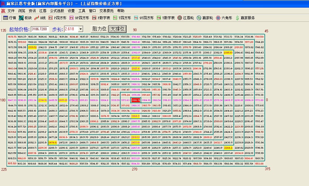 以贏家江恩系統(tǒng)江恩價格四方形為工具,選擇3186點做為起始點,步長設定為2.618,然后點擊支撐位即可,江恩四方形工具自動計算。下面通過表格以時間、指數(shù)點位、四方點位、度數(shù)、誤差5個單位做統(tǒng)計,供大家參考學習;