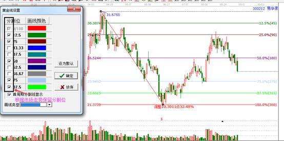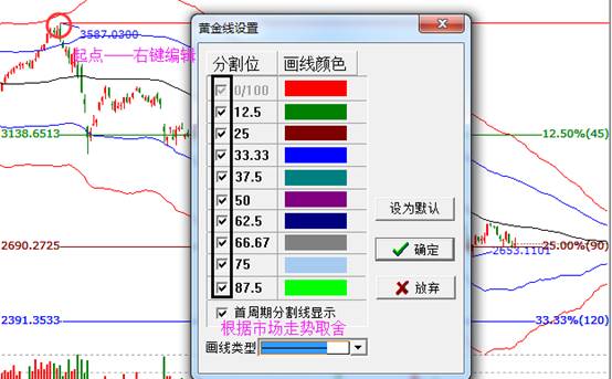 4.工具編輯。把鼠標移動到所選起點處,鼠標會變成十字狀,點擊右鍵——編輯江恩百分比,出現(xiàn)如下圖,可根據(jù)自己的經(jīng)驗需求,留下你認為重要的分割位,點擊確定即可。經(jīng)常用的設(shè)為默認。