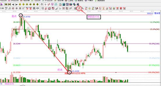 1.選點。該工具只需要選擇1個歷史上重要的高點或者低點,或結(jié)合自己的經(jīng)驗選擇你認為重要的高點或低點做起點。判斷短線支撐壓力時,可以直接選用最近的高點或低點。