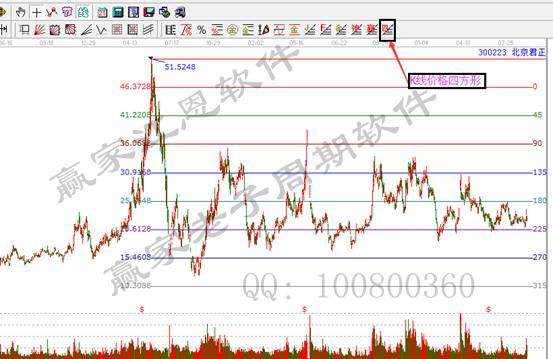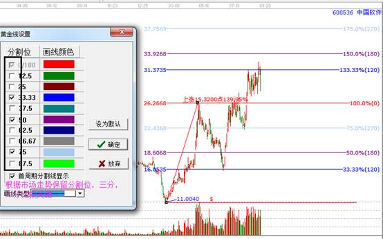 礎(chǔ)上,將倍數(shù)關(guān)系和形態(tài)空間循環(huán)用圖形展現(xiàn)出來。選擇一個歷史的波段作為起始因子,對該波段漲幅進行8分和3分。并據(jù)此作為第一個循環(huán),之后的走勢按該循環(huán)的分割比例直接往后進行延伸,所得到的位置往往成為未來重要的支撐和壓力。