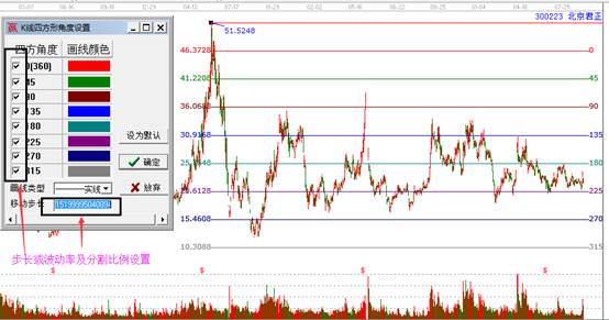 (二)研發(fā)原理:江恩波動法則、江恩圓及分割。該工具是將經(jīng)典的江恩螺旋四方轉(zhuǎn)化到K線圖形中,以便用戶更直觀的結(jié)合具體走勢發(fā)現(xiàn)價格波動規(guī)律。以一個重要的歷史高點或低點作為循環(huán)起點,按照螺旋數(shù)列計算所得到的重要點位,將是未來市場的重要支撐或壓力位。