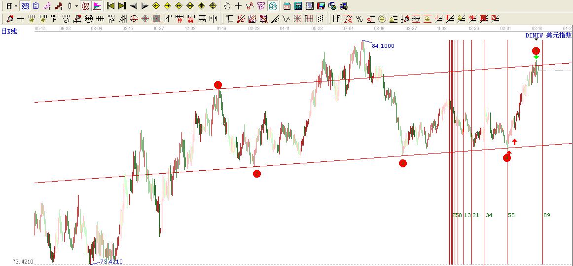 美元指數(shù)在(1)位置2012-01-13日高點(diǎn)81.784 跌至(2)位置2012-02-29日低點(diǎn)78.095點(diǎn)創(chuàng)出了新高然后在出現(xiàn)重要的低點(diǎn)(3)2012-09-14日低點(diǎn)78.601這3個(gè)重要的點(diǎn)位連接構(gòu)成了一個(gè)面。美元指數(shù)在(4)2013-02-01日見底78.918后然后上行,就是止跌于這一條提前畫出去的線。這一波的上揚(yáng)一下子就到了(5)2013-03-14日高點(diǎn)83.166點(diǎn)這里的位置剛好也在其通道的壓力位置。按照通道低位做多的嗎美元指數(shù)就要在這個(gè)位置開始平掉多單然后轉(zhuǎn)手空頭了。 而這一波的起漲位置是有其81.45點(diǎn)高點(diǎn)2012-11-16日跌至其55時(shí)間 78.9182013-02-01日開始的上揚(yáng)。而55時(shí)間后就是其89.這個(gè)時(shí)間窗口處于2013-03-22日這里一旦構(gòu)成頂部那么美元指數(shù)下跌是必然而不是偶然。